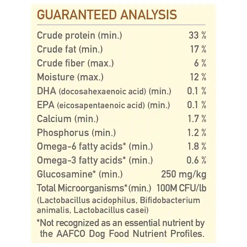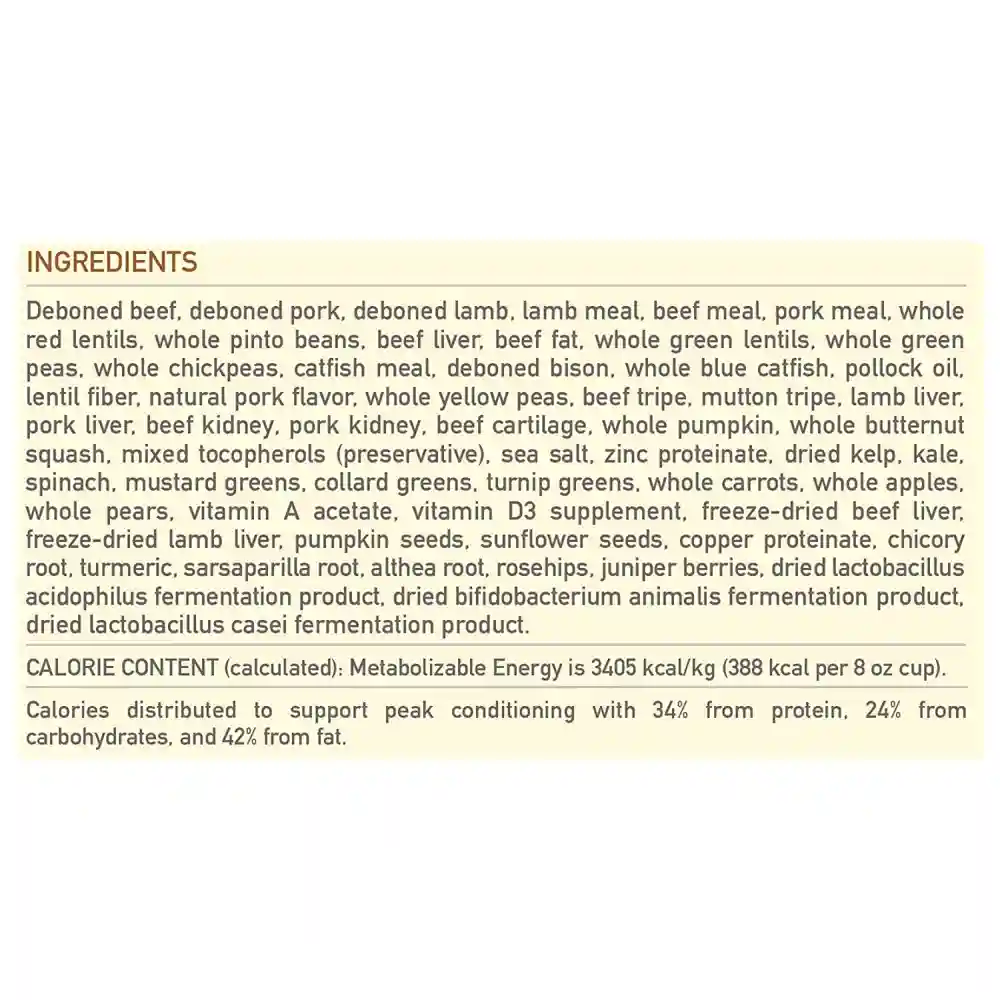- 70% fresh, raw, or dried animal ingredients in nourishing WholePrey ratios; 30% vegetables, fruits, and botanicals