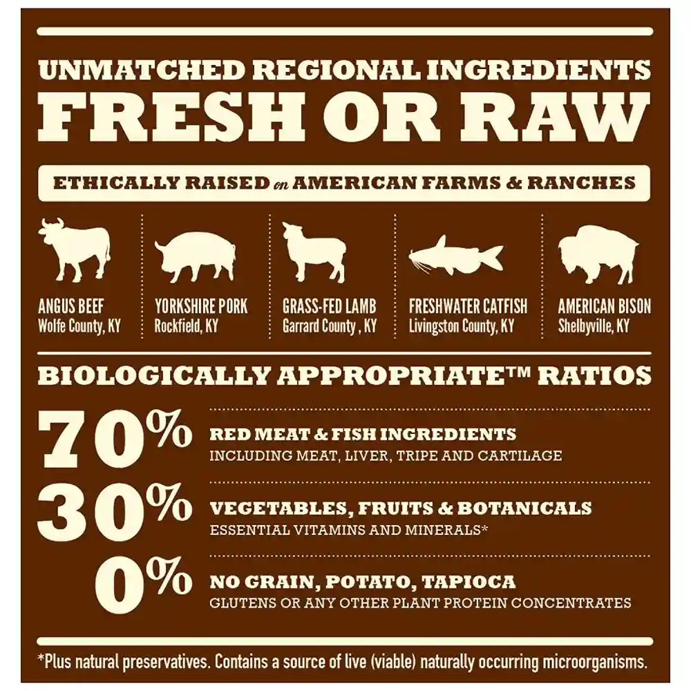 - Regionally inspired dry dog food packed with ranch-raised beef, pork, grass-fed lamb, bison, and freshwater catfish