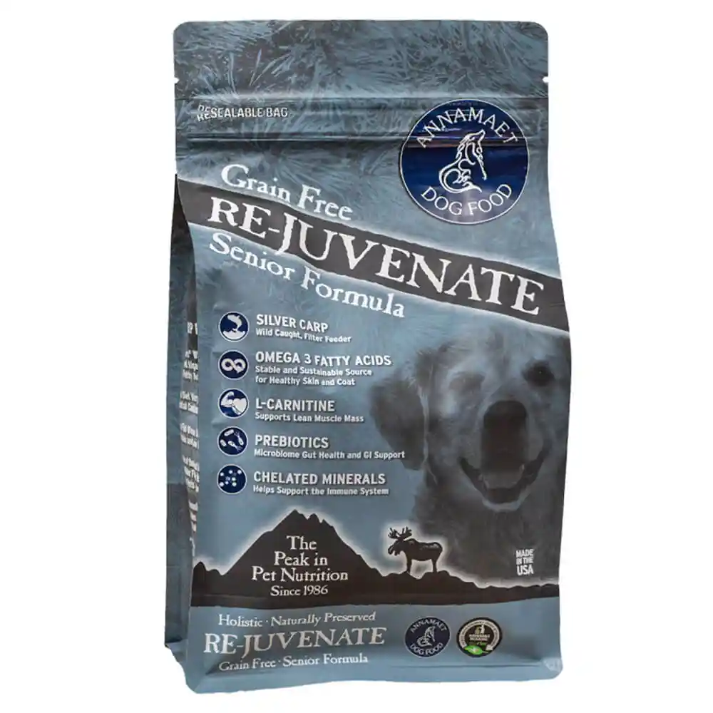 Annamaet has formulated a diet made specifcally to meet the needs of your senior dog. Annamaet Re-juvenate is made with wild caught, sustainable silver carp. These filter feeders are high in Omega 3 Fatty Acids, helping to promote healthy cognitive function in aging dogs. Silver carp are high in protein and low in fat, as seniors require more protein on a calorie basis than young adults. Annamaet Re-juvenate also contains coconut oil, which is rich in medium chain trigylcerides, well known for optimizing elderly brain function.
